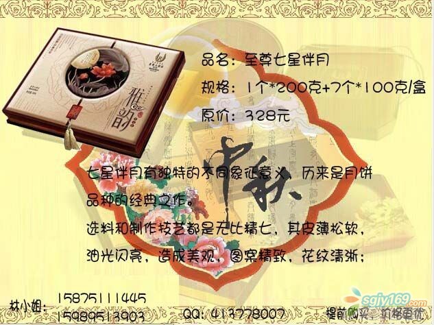 正文摘要:本帖最后由 Rachel 于 2014-9-4 09:17 編輯 萊斯七星伴月,月餅中的勞斯萊斯 五星品質,五星享受,是您送禮的最佳選擇! 最后23盒,售完即止,員工價優惠全城,快快來電吧! |