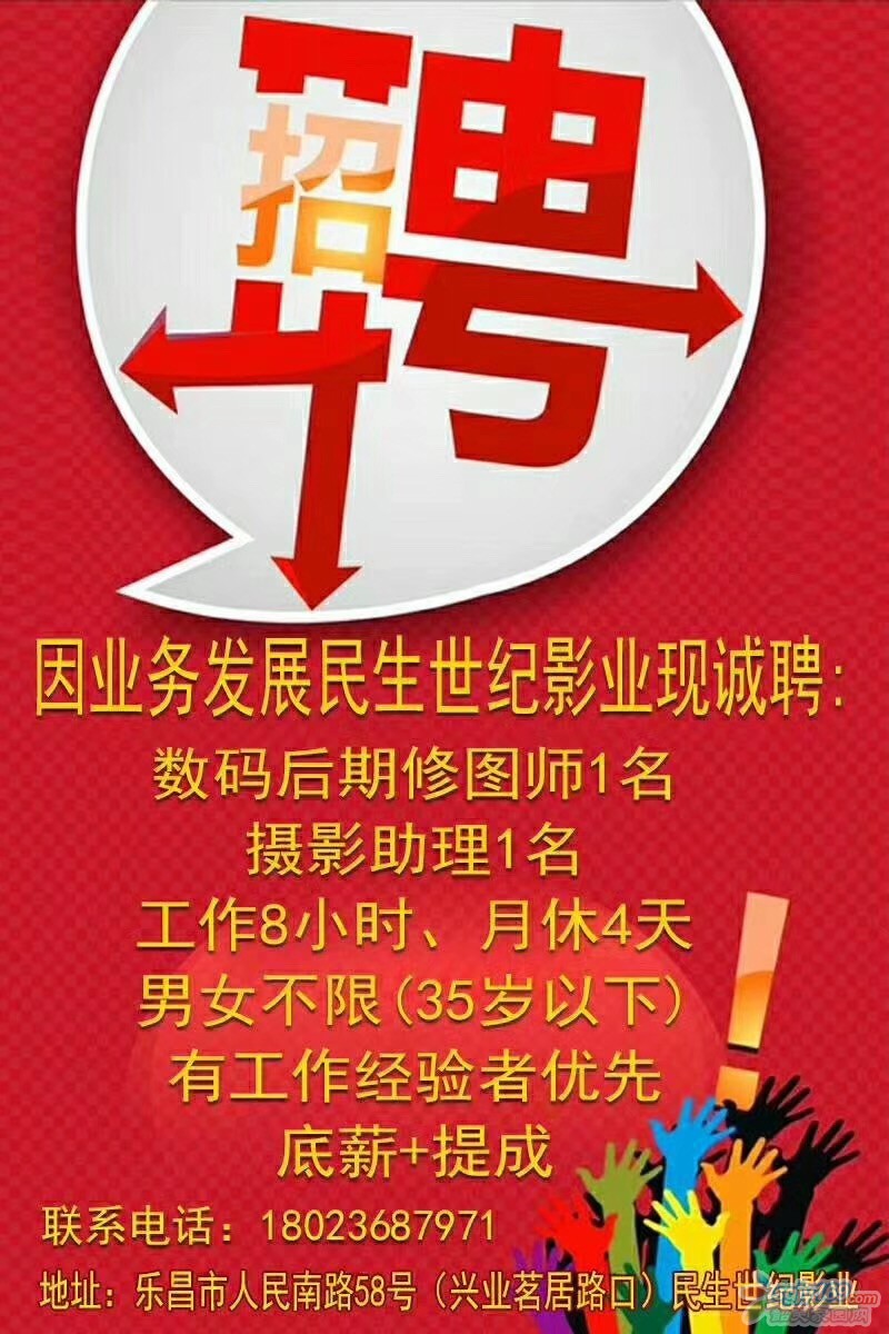 正文摘要:因業務發展民生世紀影業現誠聘: 數碼后期修圖師1名、攝影助理1名 工作8小時、月休4天 男女不限(35歲以下) 有工作經驗者優先 底薪+提成 地址:樂昌市人民南路58號(興業茗 ... |